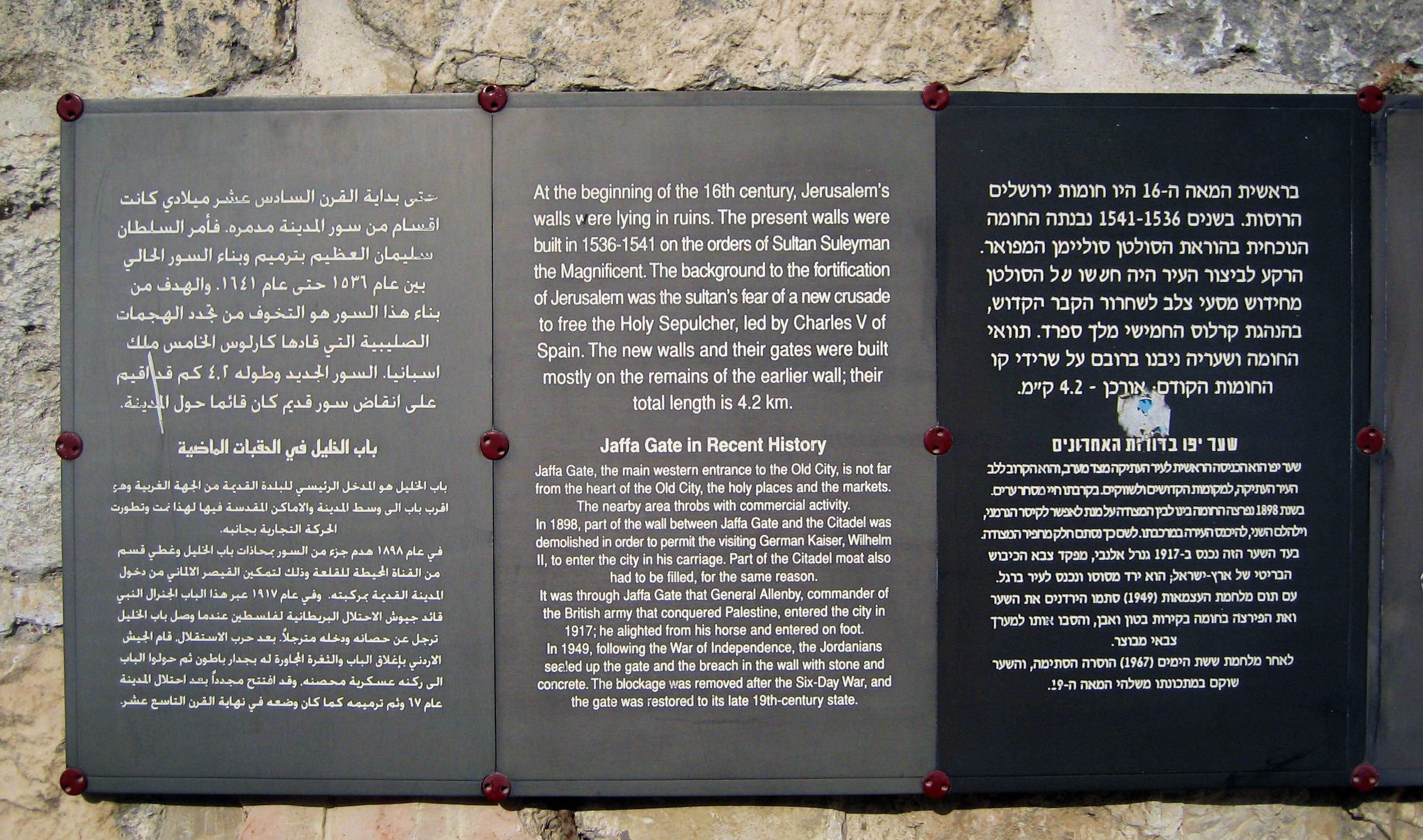Informational plaque describes history of the walls in three languages; Hebrew, English, and Arabic. One would wonder why Arabic appears first, except both Hebrew and Arabic read from right to left.